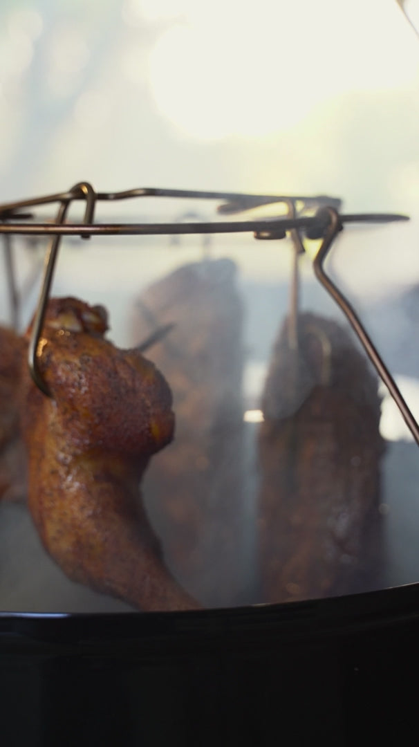 Now you can Pit Barrel® in your Weber Smokey Mountain! The WSM Hanging System by Pit Barrel® Cooker is a game changer for Weber Smokey Mountain fans. The Weber Smokey Mountain hanging system easily locks into place on the top grill brackets. The Weber Smokey Mountain hanger system allows for increased cooking capacity while delivering the famous Pit Barrel® style results. To use the Weber Smokey Mountain hanger system, simply remove the grill grate and water pan, lock the hanger system into place on the top grill bracket and open the top and bottom vent wide open. You’ll never cook a turkey or prime rib any other way. (Poultry hanger sold separately) The WSM hanging system is well built and designed capable of supporting up to 45 pounds of meat!